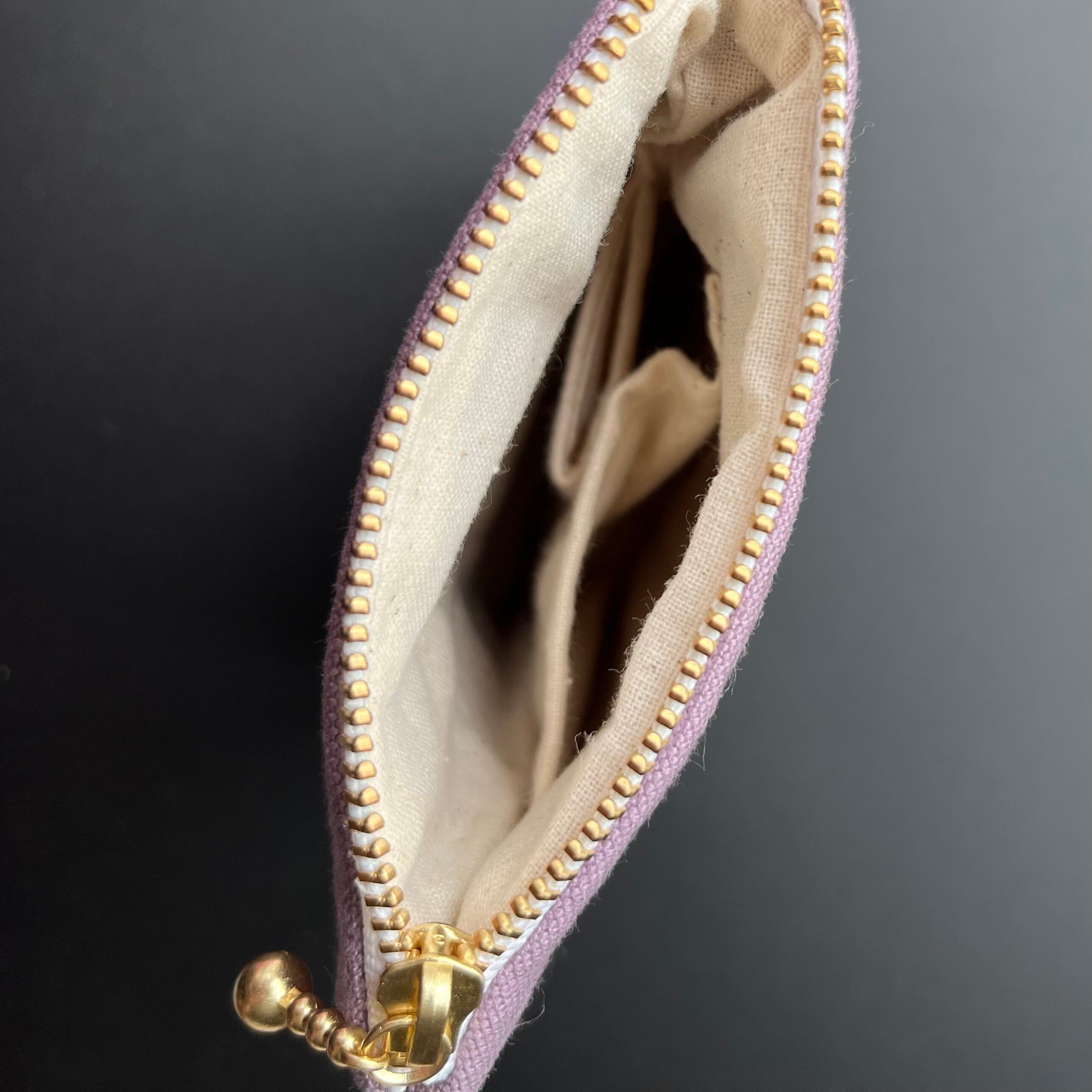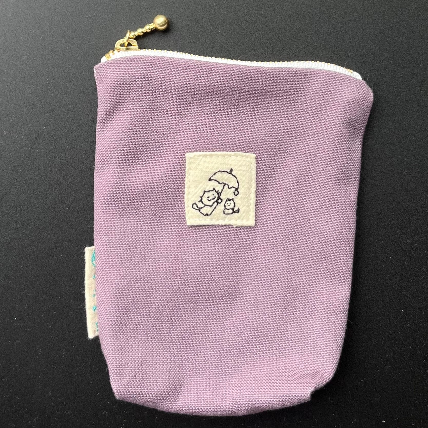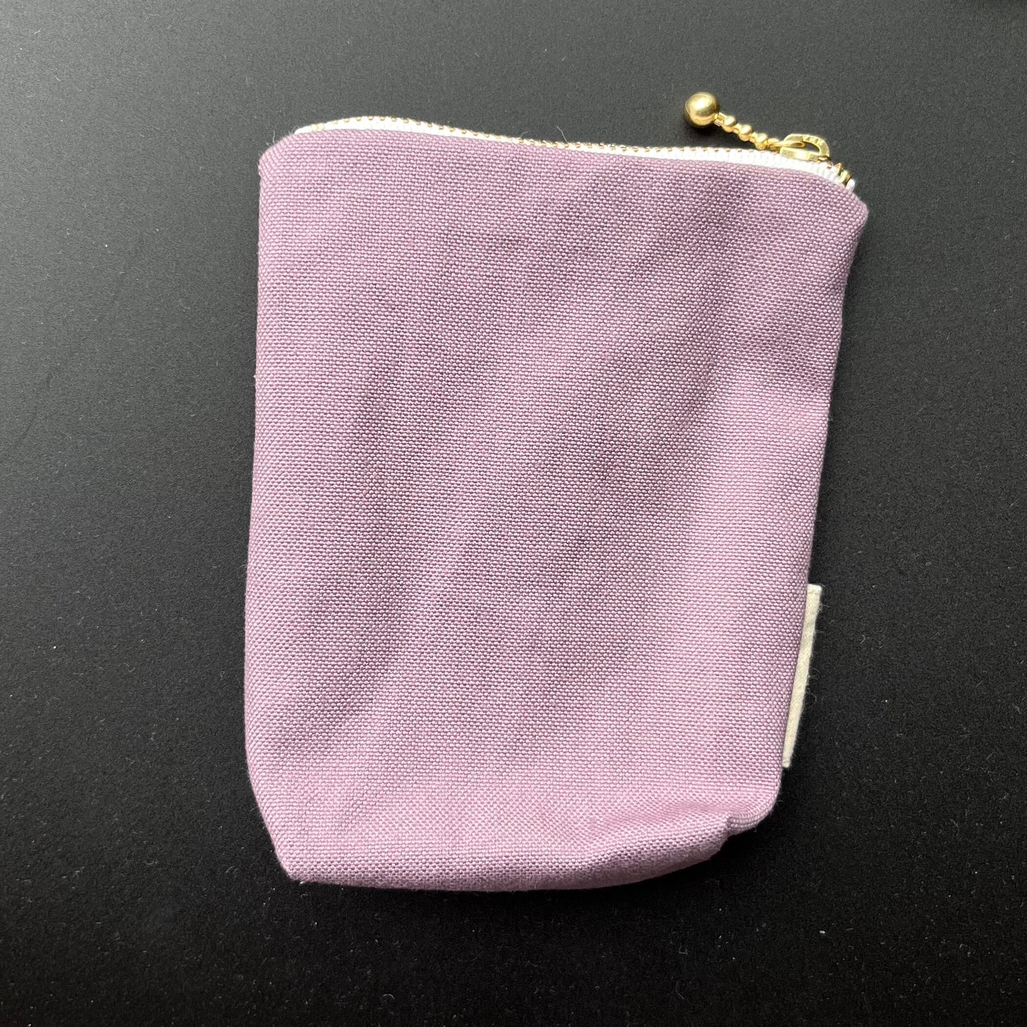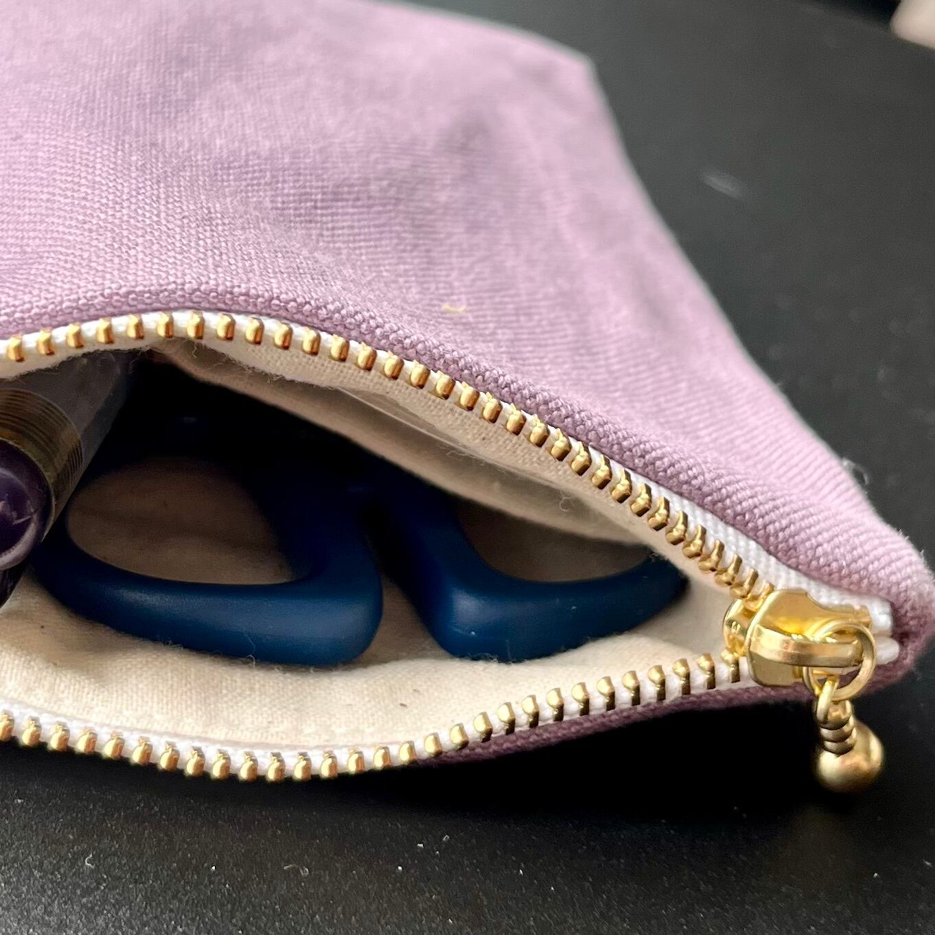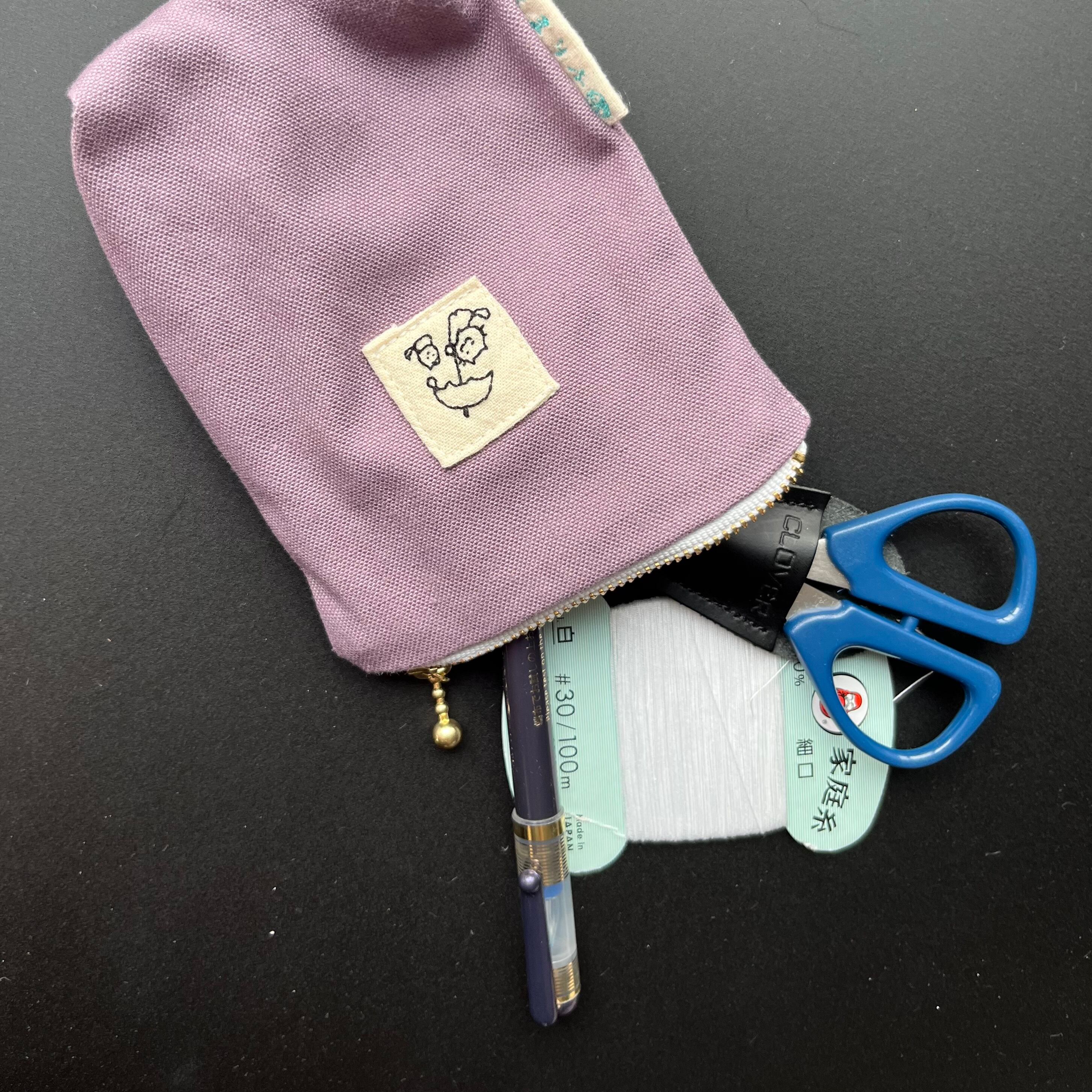 これは縦長ポーチの中でも、さらに長めで、中を覗くとポケットと支えの輪がついている【中も見てねポーチ】です。中のものが固定されるため、きちんとたくさん入ります。化粧道具や文房具、お裁縫道具を入れて歩くのにもとてもお勧めです。予定外にできた出先での空き時間に、趣味の刺繍をしたりして♡