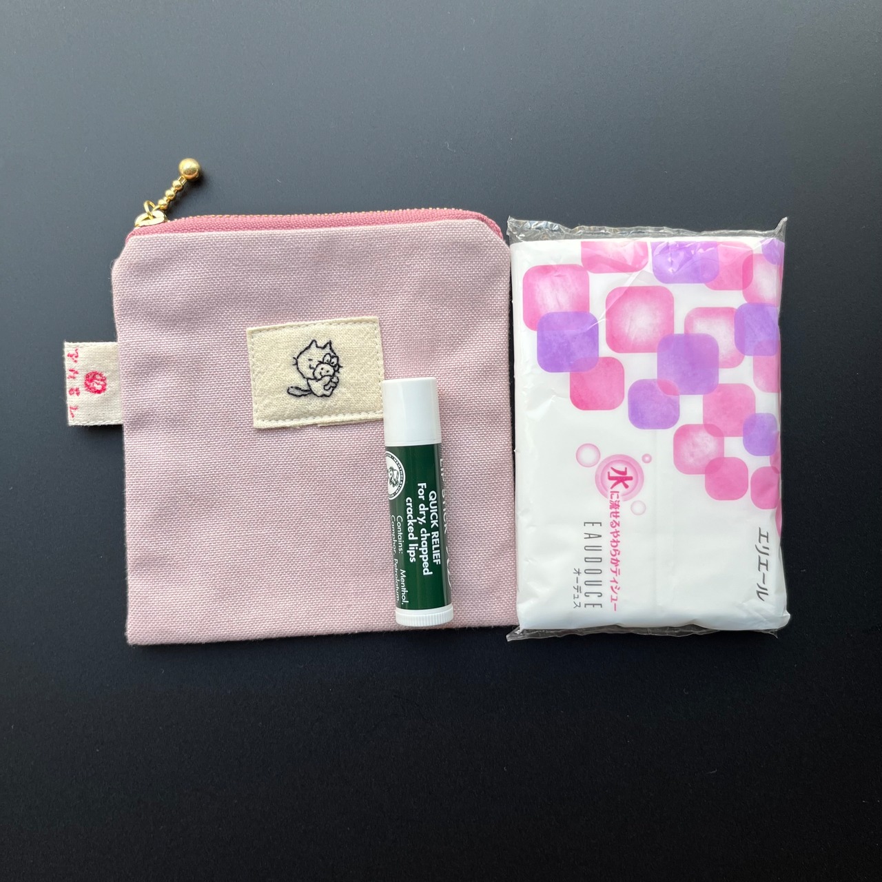 手のひらサイズのかわいいポーチは、実際に使ってみるとお解りいただけると思いますが、想像以上に便利なお助けアイテムです。カバンの中で迷子になりやすいものをしっかりお守りしますよ!